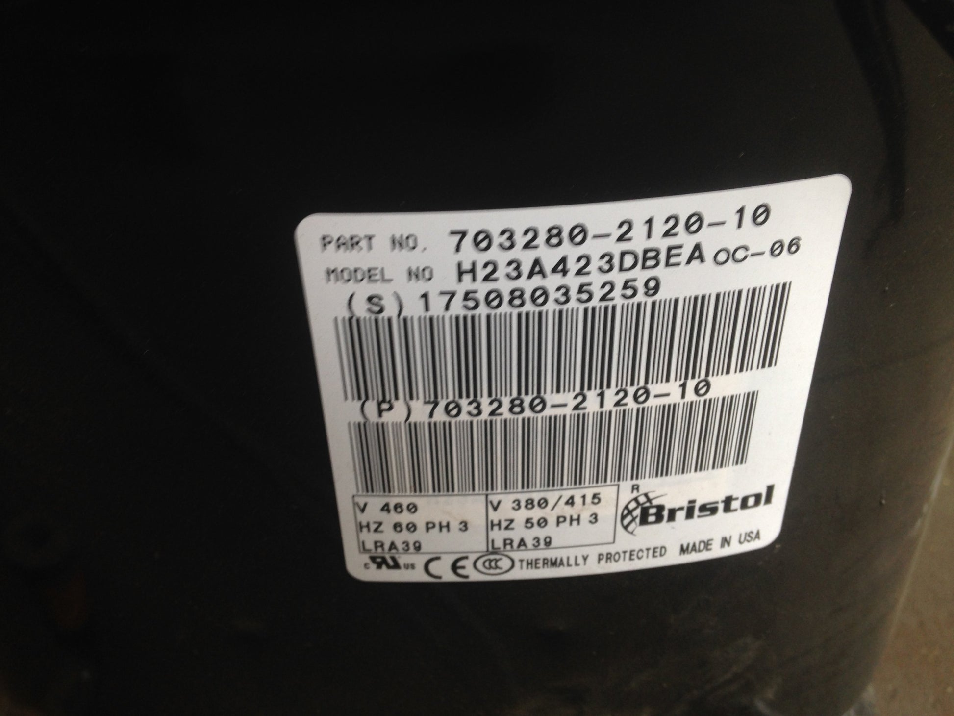 3.5 Ton AC/HP Hermetic Compressor W/Crankcase Heater, Volts:380/460, Hertz:50/60, Phase:3, LRA:39, Refrigerant:R-22, Heigth:14-5/8", Connection:3/8" X 3/4" Sweat, Base:7-1/2" X 7-1/2", Weight:80 Lbs, In Box, Origin:USA, Additional Part:703966-1100-00, P015-02933-001