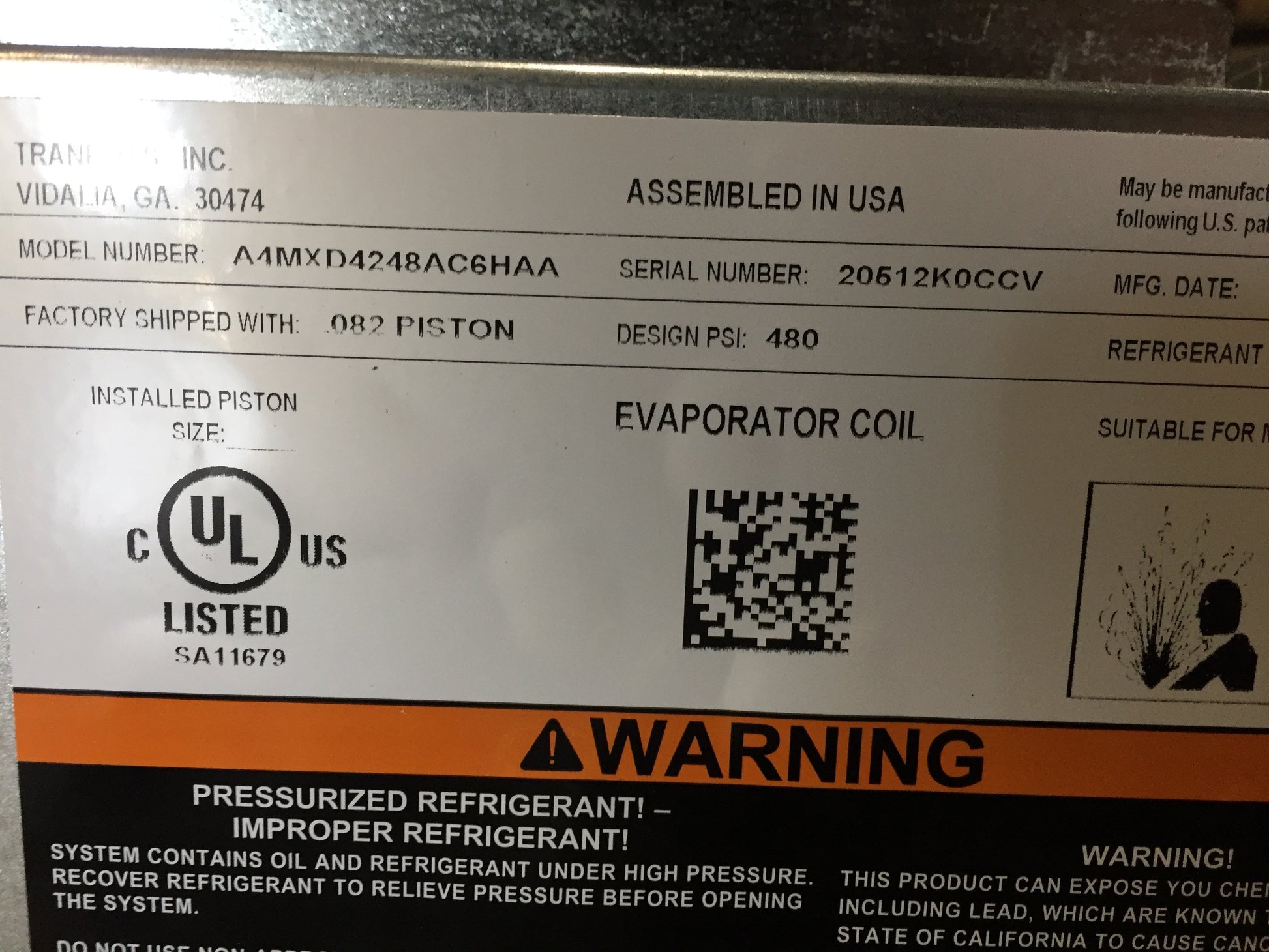 3.5-4 ton AC/HP multi-position cased 'A' coil; Airflow: multi-position, Refrigerant: R410A, Metering Device: piston (0.82), Connection Type: sweat, Connection Size: 3/8" x 7/8", Drain Pan: plastic, Overall Dimensions: 26-3/4"H x 24-1/2"W x 21-1/2"D, Weight: 64 lbs, in mfg box, Origin: USA