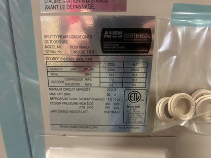 36,000 BTU Single-Zone Outdoor Inverter Heat Pump, Volts: 208-230, Hertz: 60, Phase: 1, Department Of Energy Guide SEER: 15.5, EER: 8.5, Refrigerant: R-410A, Connection Size: 3/8"x5/8", Connection Type: Flare, Metering Device: EEV, Cooling BTU: 33,000, Heating BTU: 34,000, Factory Charge: 4 lbs 10.1 oz, Dimensions: 32-11/16''H x 35-7/16''W x 13''D, Weight: 134 Lbs, ***Indoor Unit #RIWH36AXJ Not Included*** ***Unit includes a Manufacture Warranty, register your unit with the Manufacturer for details***