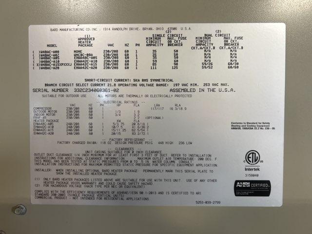 11, Factory Charge: 7.38 lbs, Heat: 15 Kw Heat kit installed with Breaker, 5 Speed ECM Blower Motor, CFM: 1,550, Overall Dims: 84-7/8''H X 42''W X 25-13/25''D, Weight: 495 lbs