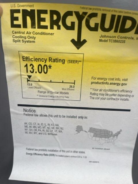 5 Ton Split-System Air Conditioner, Circuit Voltage: 208-230, Hertz: 60, Phase: 1, Department Of Energy Guide SEER: 13, Stage: Single, Refrigerant: R410A, Connection Size: 3/8"X7/8", Connection Type: Sweat, Factory Charge: 5 Lbs 6 Oz, Type: Air, Dimensions: 36-1/4''H X 29-1/4''W X 29-1/4''D, Weight: 175 Lbs, In Mfg Box, Made In USA.