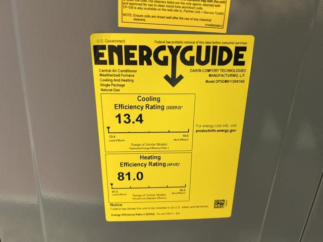 1, Refrigerant: R410A, Factory Charge: 100 oz, EER2: 10.6, Department of Energy Guide SEER2 (Range): 13.4, CFM: 1950, BTU Input: 120,000, BTU Output: 97,200, Cooling BTU: 56,000, Heating BTU: 120,000, Overall Dims: 42-1/2''H X 47''W X 51''D, Weight: 543 lbs ***Unit includes a Manufacture Warranty, register your unit with the Manufacturer for details***