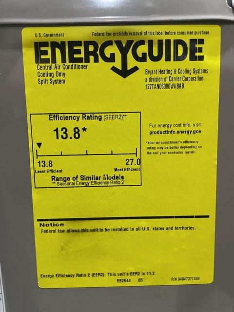 5 Ton Two Stage Split-System Air Conditioner, Circuit Voltage: 208-230, Hertz: 60, Phase: 1, Department of Energy Guide SEER2: 13.8, Stage: Two, Refrigerant: R410A, Connection Size: 3/8"X7/8", Connection Type: Sweat, Factory Charge: 9.27 lbs 9 oz, Type: Air, Dimensions: 38-7/8''H x 35''W x 35''D, Weight: 256 lbs
