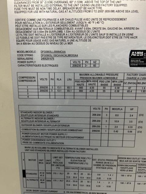 3, Refrigerant: R410A, Factory Charge: 67/65.4 oz Dual Circuit, EER: 11.2, CFM: 3763, BTU Input: