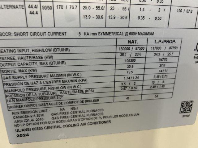 130,000, BTU Output: 105,300, Cooling BTU: 86,000, Heating BTU: 130,000, Overall Dims: 54-5/8''H X 60-3/8''W X 93-3/4''D, Weight: 1040 lbs