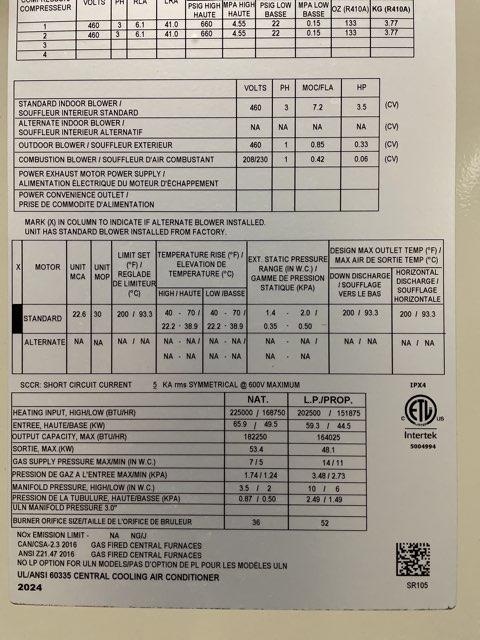 225,000, BTU Output: 182,250, Cooling BTU: 90,000, Heating BTU: 225,000, Overall Dims: 54-9/20''H X 93-3/4''W X 60-3/8''D, Weight: 1181 lbs