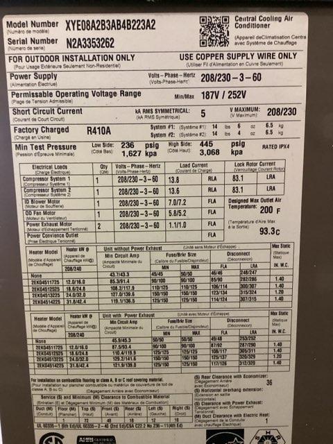7.5 Ton Two Stage Convertible Packaged Heat Pump Unit, Volts: 208-230, Hertz: 60, Phase: 3, Refrigerant: R410A, Factory Charge: 14.25 lbs, EER: 12.1, CFM: 2850, Overall Dims: 55-3/10''H X 61-2/3''W X 87-1/5''D, Weight: 1060 lbs ***Compatible Heat Kit: 2EK0451(17-42)25 (Not Included)***