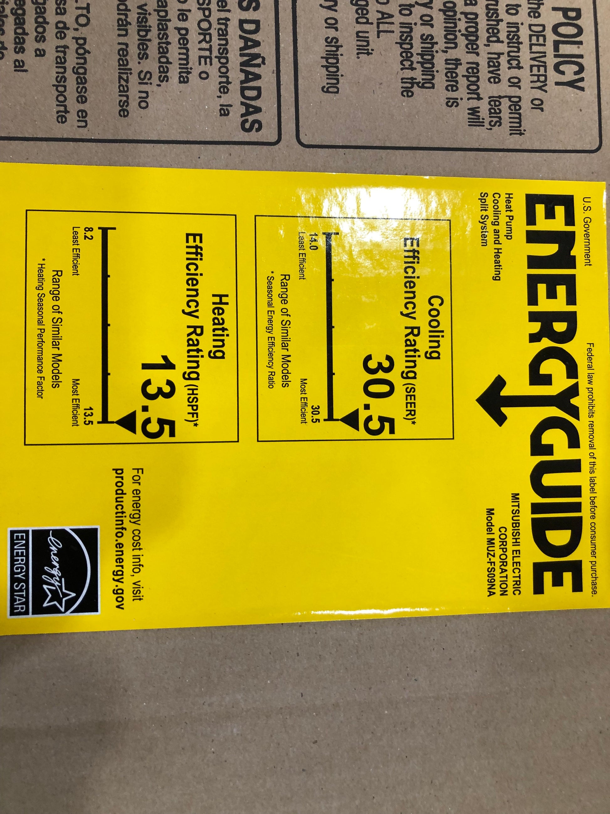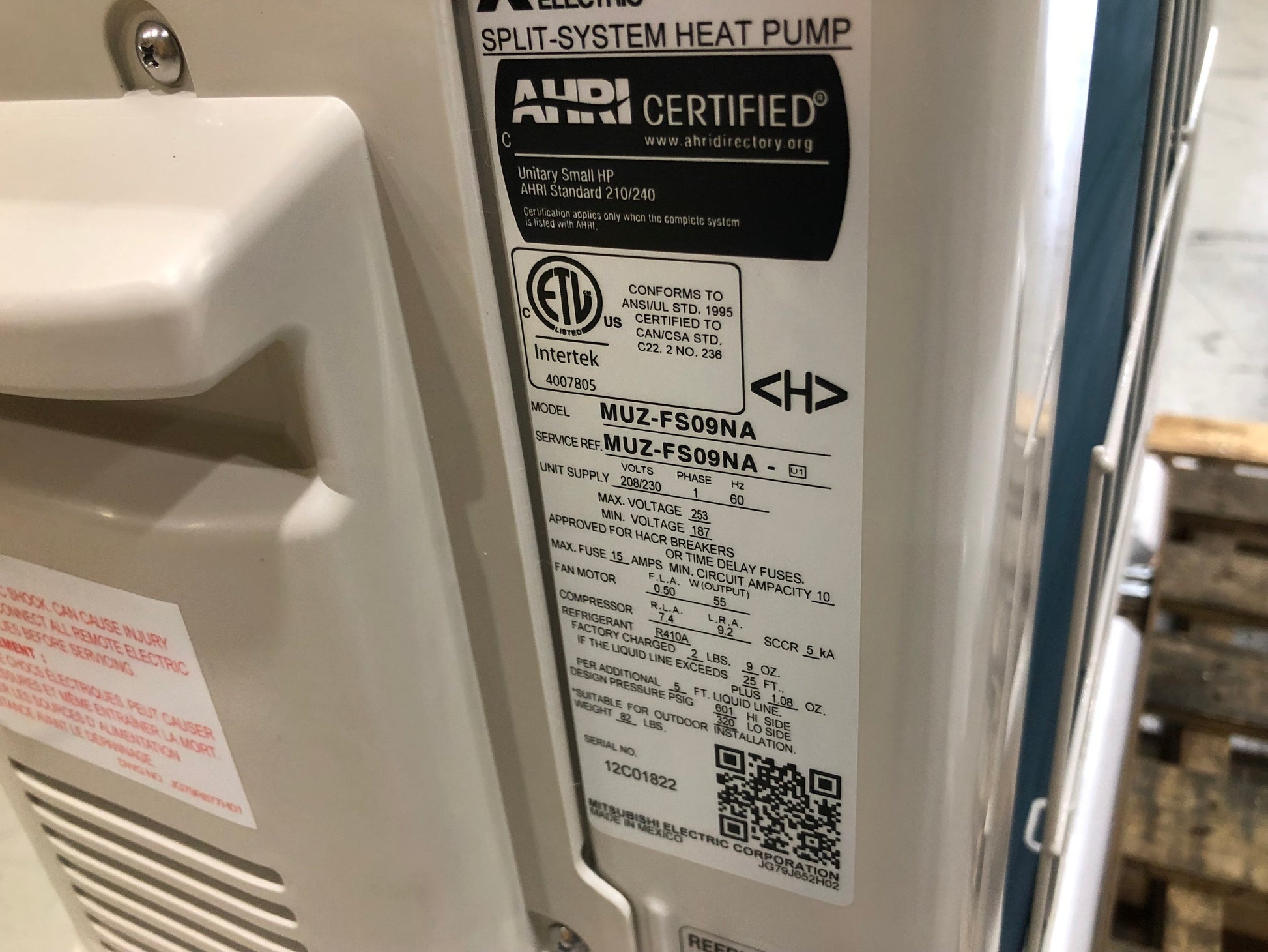 9,000 BTU Single-Zone Mini-Split Outdoor Heat Pump, Volts:208/230, Hertz:60, Phase:1, Refrigerant:R-410A (Factory Charged 2 Lbs 9 Oz.), SEER: 30.5, Type: Air Source, Connections:1/4" X 3/8" Flare, Rated Cooling BTU: 9,000, Rated Heating BTU: 9,600, Dims:24 1/2"H X 37"W X 15"D, Weight: 82 Lbs, In Mfg Box, Made In Mexico. For Use With Indoor Model:MSZ-FS09NA (Not Included)