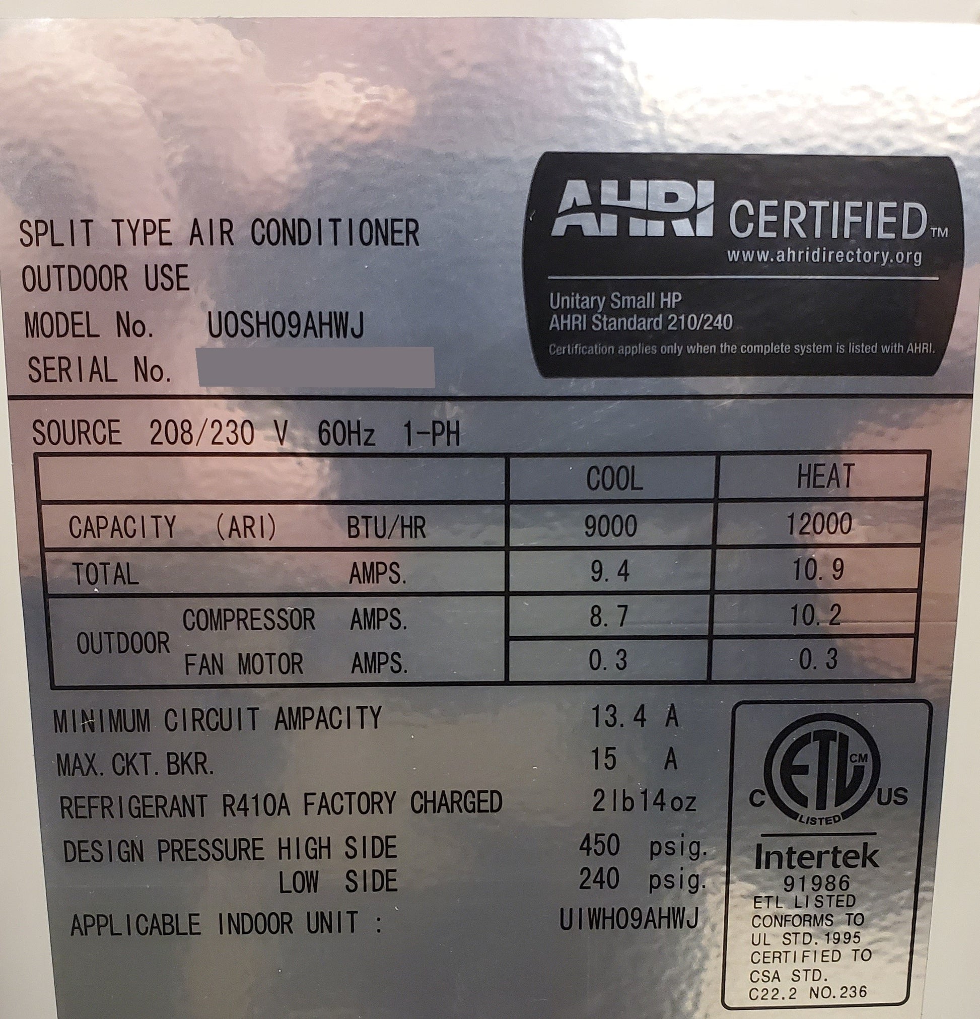 9,000 BTU "Ultra" Series Single-Zone Inverter Outdoor Mini-Split Heat Pump Unit, Voltage: 208/230, Hertz: 60, Phase: 1, Refrigerant: R-410A, SEER: 33, Connection Size: 1/4" X 3/8" Flare, Outdoor Dims: 24-7/16"H X 31-1/8"W X 12"D, Outdoor Weight: 84 Lbs, In Mfg Box, Made In PRC. For Use With Indoor Unit UIWH09AHWJ (Not Included)