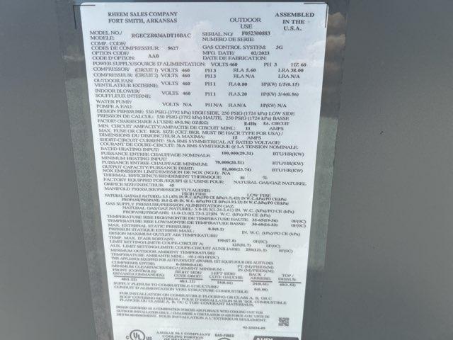 3 Ton Two Stage Convertible Natural Gas/Electric Packaged Unit, Volts: 460, Hertz: 60, Phase: 3, Refrigerant: R410A, Factory Charge: 68 oz, EER: 11.2, Department of Energy Guide SEER: 14, CFM: 1300, BTU Input: 100,000, BTU Output: 70,000, Cooling BTU: 36,000, Heating BTU: 100,000, Overall Dims: 41-3/8''H X 79-1/4''W X 46-3/4''D, Weight: 557 lbs