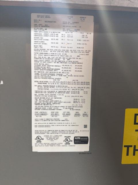 5 Ton Single Stage Convertible Natural Gas/Electric Packaged Unit, Volts: 460, Hertz: 60, Phase: 3, Refrigerant: R410A, Factory Charge: 82 oz, EER: 11, Department of Energy Guide SEER (Range): 14, CFM: 2250, BTU Input: 120,000, BTU Output: 84,000, Cooling BTU: 59,500, Heating BTU: 120,000, Overall Dims: 46-3/4''H X 79-1/4''W X 46-3/4''D, Weight: 583 lbs