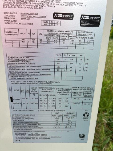 3, Refrigerant: R410A, Factory Charge: 222/207 oz Dual Circuit, EER: 9.8, CFM: 8200, BTU Input: