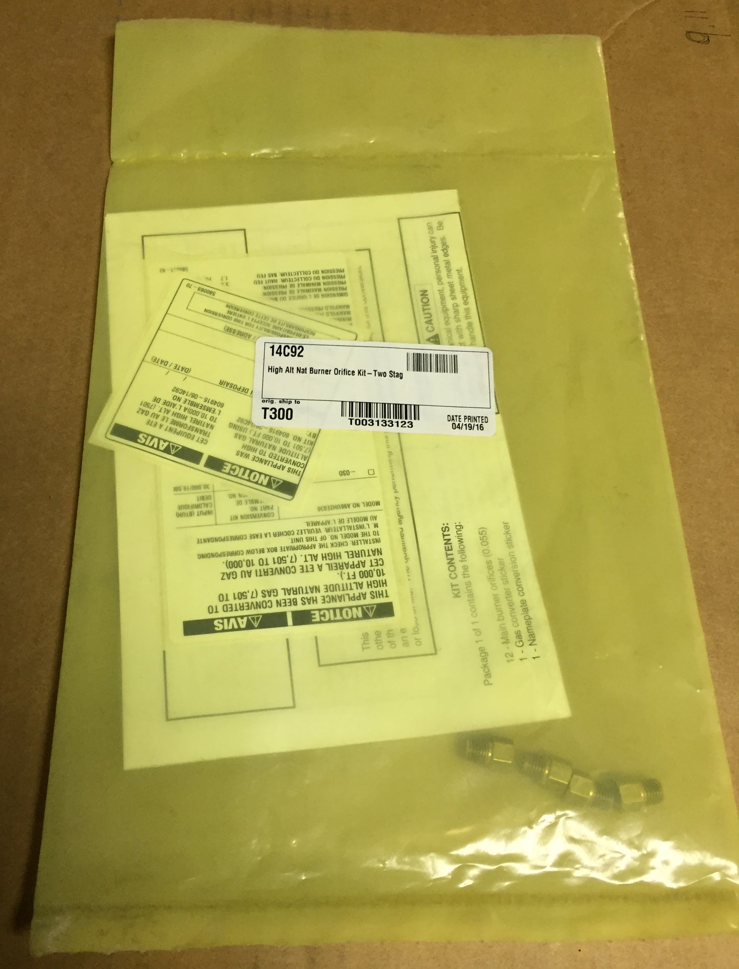 High Altitude Natural Gas Burner Orifice Kit - 2 Stage, Package Contains: (12) 55 Main Burner Orifices, (1) Installation Instructions, (1) Gas Conversion Label, (1) Nameplate Conversion Label; Weight: 1/2 Lb, Bag Dims:8"H X 14"W X 1/2"D, In Mfg Bag, Made in USA.