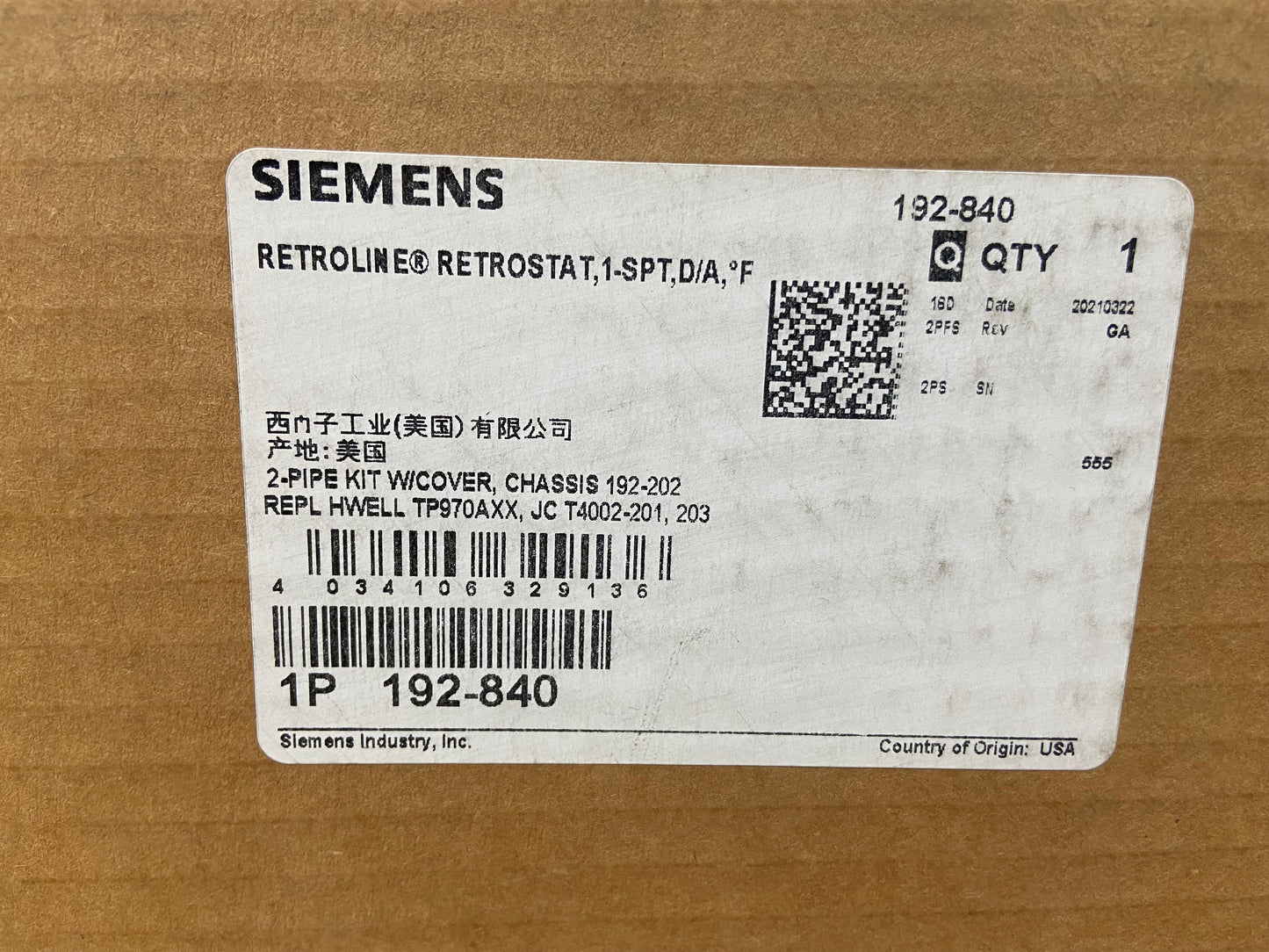 Pneumatic Room Thermostat Retrostat Kit, Direct Acting Thermostat, Type: St-2P, Range: 45-85 F, Air Supply: (Min) 8PSI, (Max) 30PSI, (Normal) 18-25PSI, Includes: Thermostat w/Wallplate(039003), T-Stat Cover(192-256W), Adaptor Base w/Hardware(192-842), Weight: 1Lb 3.6oz, Mfg Box, Made in USA