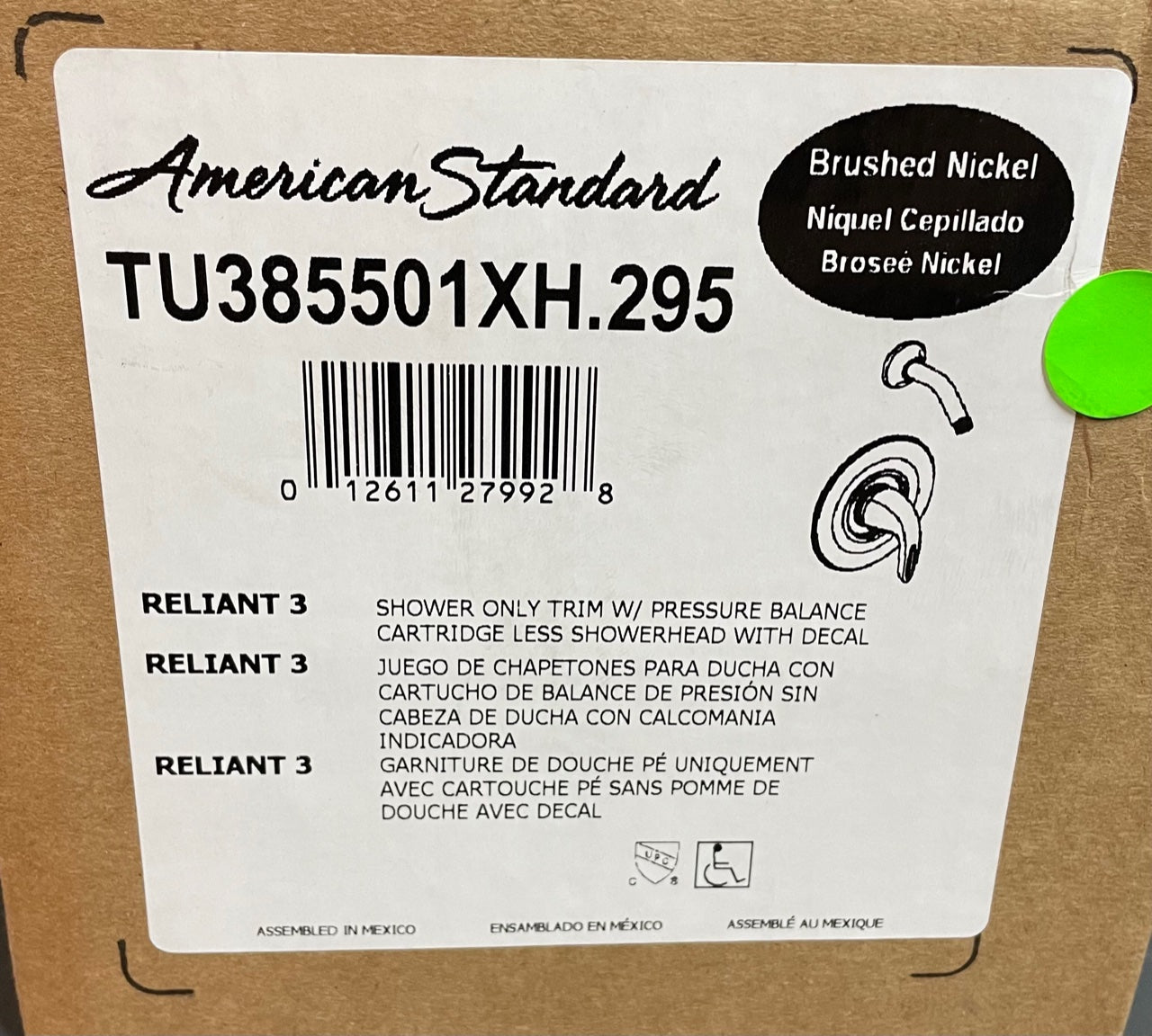 Reliant 3 Brushed Nickel Shower Only Trim/W Pressure Balance Cartridge/Less Showerhead With Decal, Weight:4 Pounds, In Mfg Box, Made In Mexico.