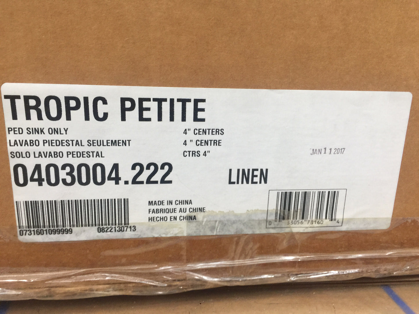 Tropic Petite Pedestal Sink Only, Color: Linen, 4" Centers, 3 Faucet Holes, Material:Vitreous China, Diminsions: 23" X 20.375" X 9", Mfg Box, Made In China Ships Via LTL Freight And Does Not Qualify For Free Ground Shipping