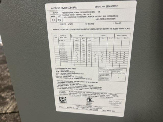2 Ton AC/HP Multiposition Variable Speed ECM Fancoil 208-230/60/1 R-410A CFM 800 16 Seer